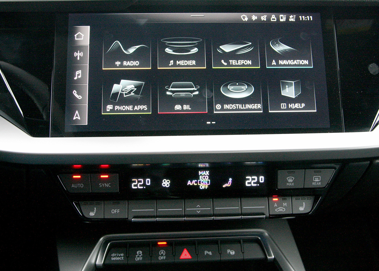 Fanfarer og klapsalver til Audi for at bibeholde velfungerende trykknapper til de mest basale funktioner. Dens tre billigere fætre har ladet sig rive med af digitaliseringen, så bare det at justere sædevarmen kræver en kompleks og opmærksomheds-stjælende handling. Tak, Audi, for at bevare det kølige overblik.