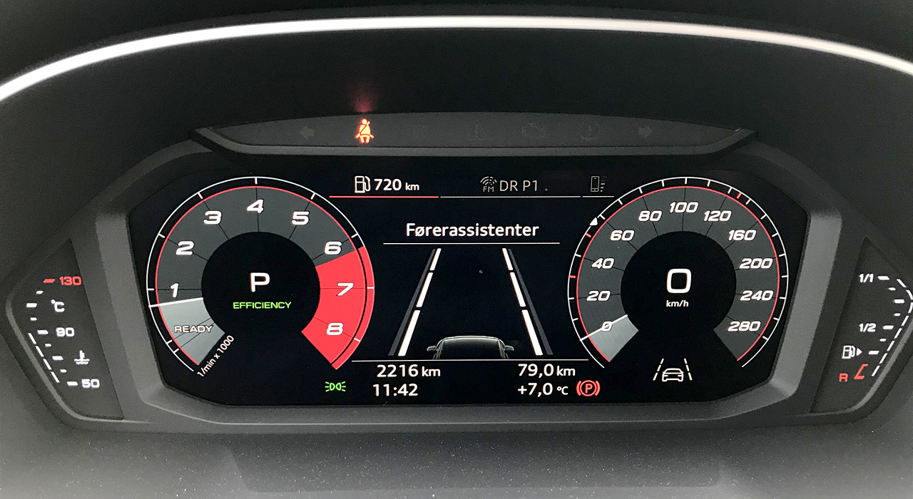 Digitale instrumenter lige i førerens synsfelt og en 8,8 tommer touchscreen i midterkonsollen - man kan udvide begge i både størrelse og antal funktioner - er lette at aflæse og nemme at betjene. Skærmopløsningen er imponerende, og jeg glæder mig over, at Audi ikke er forfaldet til at lade betjening af klimaanlæg indgå som en del af den berøringsfølsomme skærm. Man indstiller stadig temperaturen på en drejeknap, og man tænder stadig for sædevarme og elbagrude med et tryk på en knap, som man efter få gange ikke er i tvivl om, hvor befinder sig.