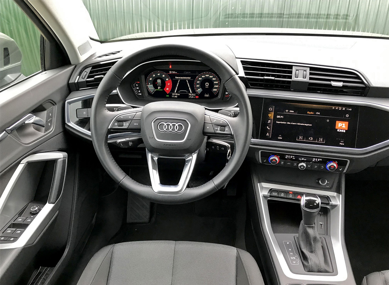 Den, der tager plads bag rattet af en Q3, kan glæde sig over en forbilledlig indretning. Materialevalget er fra øverste skuffe, knapper og kontakter klikker på den der særlige Audi-måde, der signalerer kvalitet og “bare brug mig, om 10 år virker jeg stadig”.
