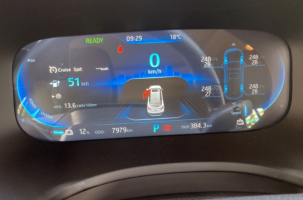 Dele af dørsider og instrumentpanel består af hård, musegrå plastik. Under den 10,25 tommer berøringsfølsomme skærm sidder et display til justering af blandt andet elbagrude og det 1-trins klimaanlæg. Fingertrykket skal være bestemt for at få en reaktion, og stilles klimaanlægget på “auto” og temperaturen på 22 grader, bliver man mødt af polarluft fra dyserne. Man skal op i nærheden af 27-28 grader for ikke at småfryse, så løsningen er at slå “auto” fra og justere sig frem derfra.