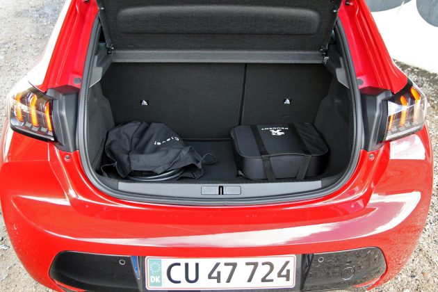 Bagagerummet sluger i princippet 265 liter - mindre end forgængeren - men da heller ikke Peugeot har løst “udfordringen” med hensigtsmæssig opbevaring af ladekabler, ligger de der i bagagerummet og fylder op. Har man både mormorkabel og avanceret kabel til lynopladning i en fin taske, trækker det for alvor ned.