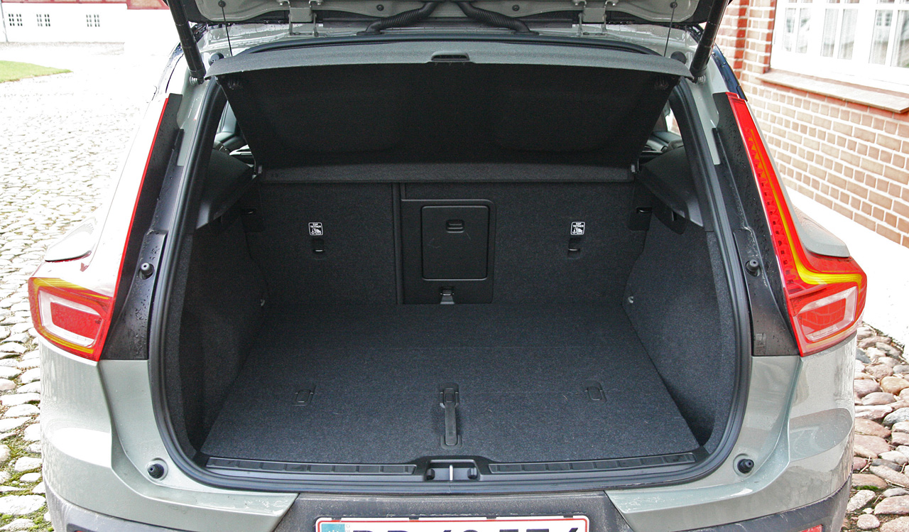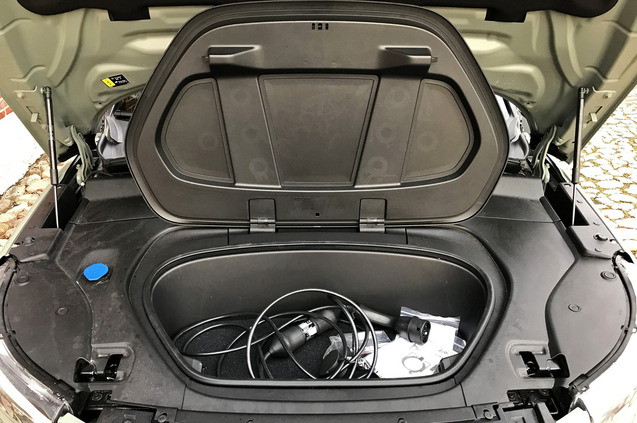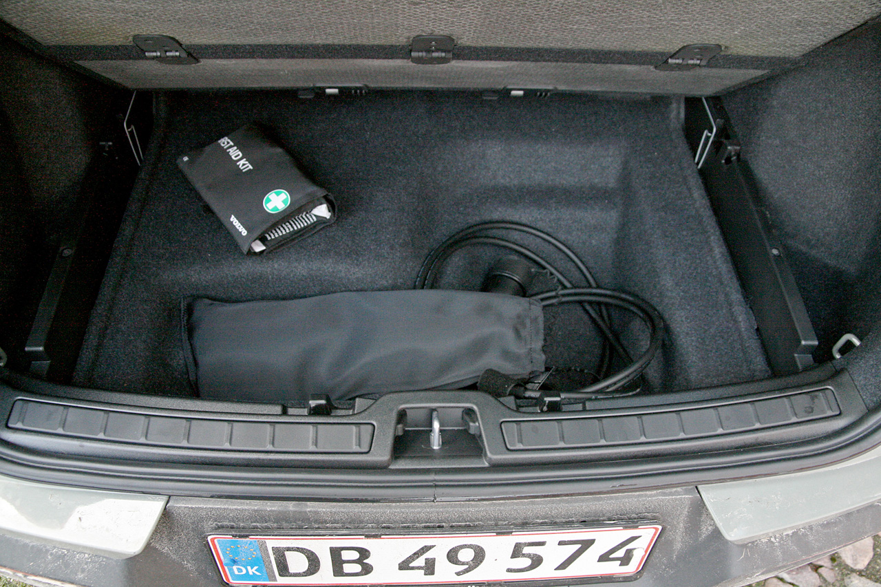 Bagagerummet tager 414 liter, hvilket er 43 liter færre end i de ikke-eldrevne, men under gulvet findes en ganske rummelig kælder og foran et såkaldt »frunk«, altså et lille opbevaringsrum på 31 liter, hvor man passende kan stuve sine ladekabler af vejen.
