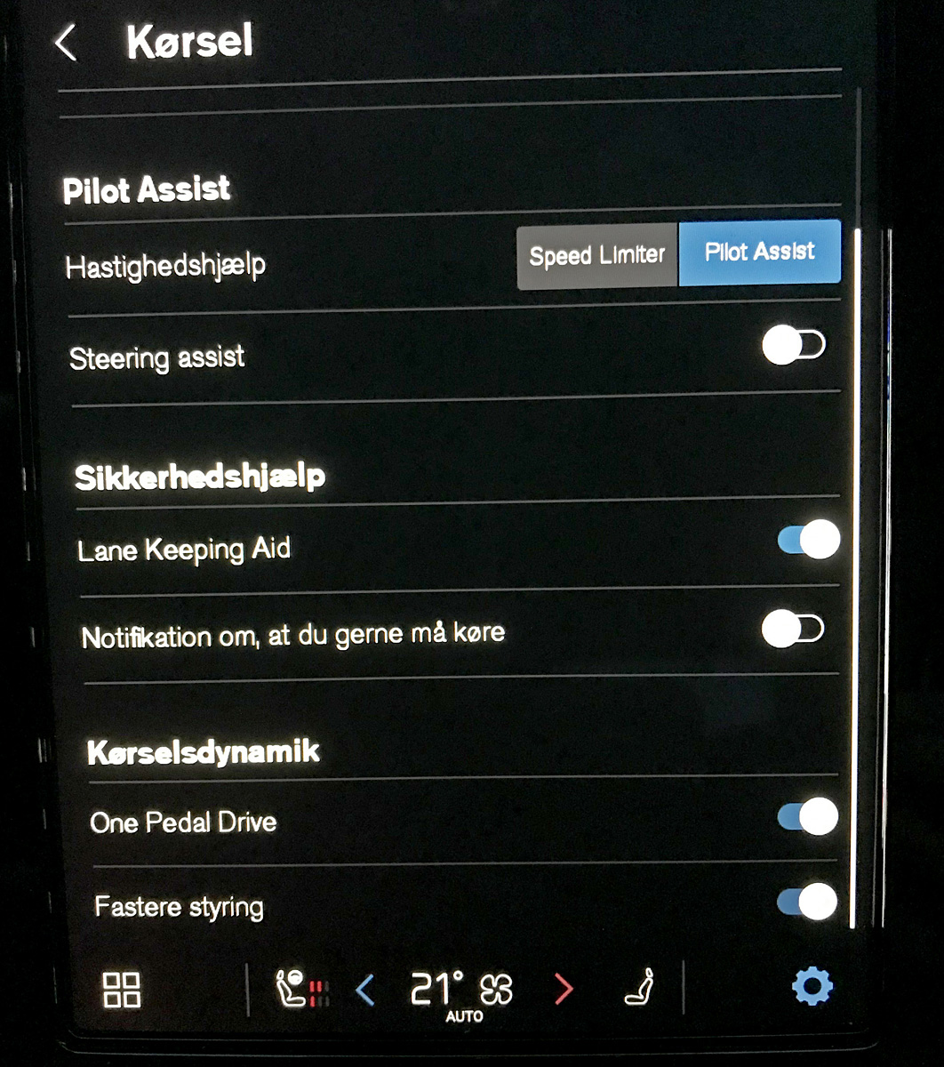 Desværre skal man også via touchskærmen for at aktivere og fintune Pilot Assist, hvis man f.eks. helt eller delvist ønsker at frakoble den aktive vognbaneassistent. Man skal også via skærmen for at til- eller frakoble det såkaldte One Pedal Drive – rekuperation – der er genial i bykørsel, hvor man stort set udelukkende kan køre bilen med speederen og ved fartreduktion tanke en pæn portion strøm på batteriet.