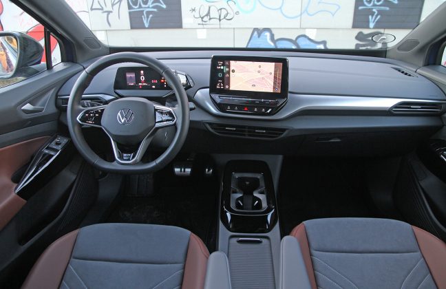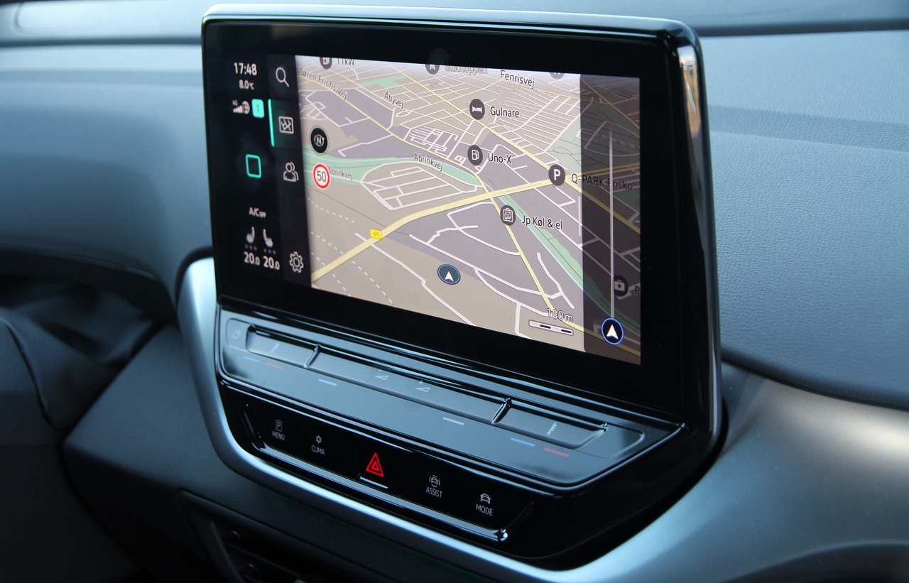Ved første øjekast er der ingen forskel på førerpladsen i ID.4 og ID.3. Samme lille digitalspeedometer bag rattet, 10-tommers infotainmentskærm i midterkonsollen med diverse apps og et generelt fravær af knapper. Men du sidder højere og kan nyde udsigten over en længere kølerhjelm med potente buler over forhjulene. Og mens vi sætter pris på overblikket og det enkle udtryk, er akilleshælen selve betjeningen: VW er fortsat langt efter Tesla, når det gælder om at skabe forbindelse mellem mand og maskine. Infotainmentsystemet er et mindre mareridt af langsom software, ulogisk opbygning og ’touch-betjening’, der kræver alt for lange blikke på skærmen. Stemmestyringen blander sig så ofte og umotiveret, at vi endte med at slukke for den. Når hele systemet da ikke bare gik i sort af sig selv. Det er en ommer VW – det er alt for tydeligt, at softwaren er udviklet i et land, der stadig sværger til fax og skrivemaskiner…