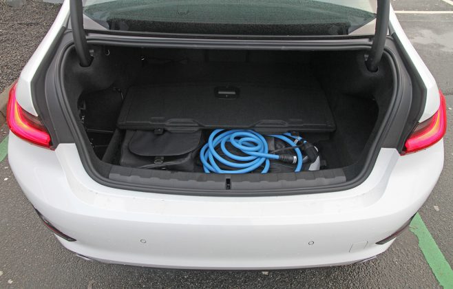 Mens hybridteknikken ikke gør indhug i kabinepladsen, koster den i bagagerummet. Batteriet reducerer kapaciteten fra 480 til 375 liter, så måske bliver det nødvendigt at indføre restriktioner for familiens oppakning på de lange ferieture. Til gengæld opholder man sig gerne længe i kabinen: BMW holder fast i sit grundlæggende kabine-design, men 3-serien er solidt skruet sammen. Selv ikke dybe kloakdæksler, skarpe kanter eller frostvejr kunne aftvinge knirkelyde i testugen.