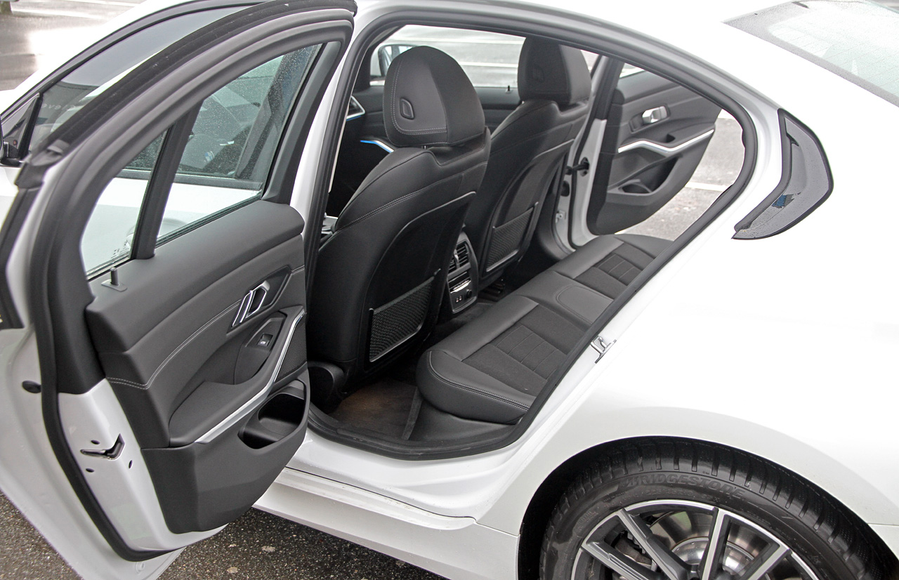 Selv om BMWs 3-serie har hele 285 cm mellem akslerne, er pladsen på bagsædet fortsat mere afmålt end overdådig. Det følger med bilens beskedne højde, hvor der er brug for at sidde med ret strakte ben. Langsplaceret motor og baghjulstræk kræver også plads.