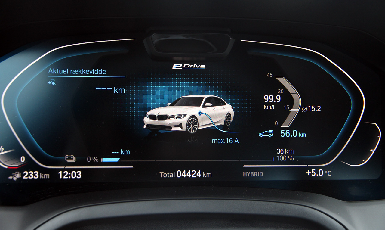 I 330e er de digitale instrumenter med til at give overblik over, hvordan du får mest ud af hybridteknikken. Tydelig angivelse af energiforbruget gør det til en sport at spare. Navigation er blevet standard, hvilket er praktisk, fordi du hele tiden kan se, hvor nærmeste ladestation befinder sig. Og så er iDrive systemet, hvor du bruger en dreje-trykkeknap til skærm-navigation, finpudset og udvidet med mulighed for at trykke direkte på den knivskarpe skærm. BMW er efterhånden blandt de bedste til at lave intuitiv infotainment.