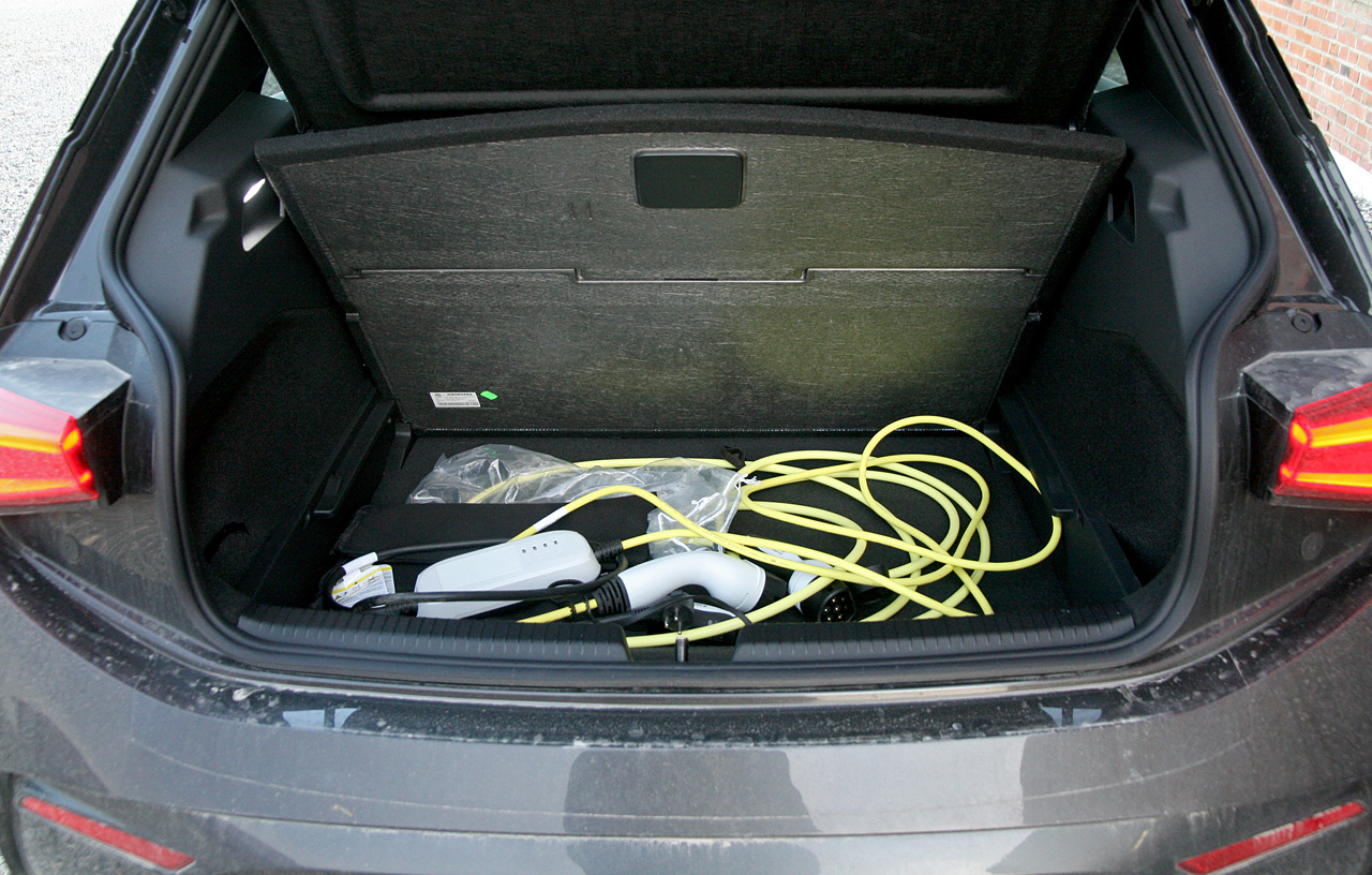 Bagagerummet på 385 liter svarer til det, en femdørs Seat Leon byder på. Fraværet af fossilmotor har ikke skaffet rum til et frunk under frontklappen, men kablerne til opladning kan stuves af vejen i bagagerummets kælder.