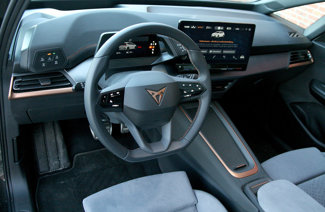 Hvor kvalitetsfornemmelsen i VW ID.3 er langtfra den standard, man kunne forvente af et VW-produkt, så er Cupra Born anderledes fremme i skoene. Kabinen er mere indbydende at skue, og der er masser af fysisk lækkerhedsfornemmelse ved at røre dørsider, midterarmlæn og tage plads i de glimrende standardsæder.
