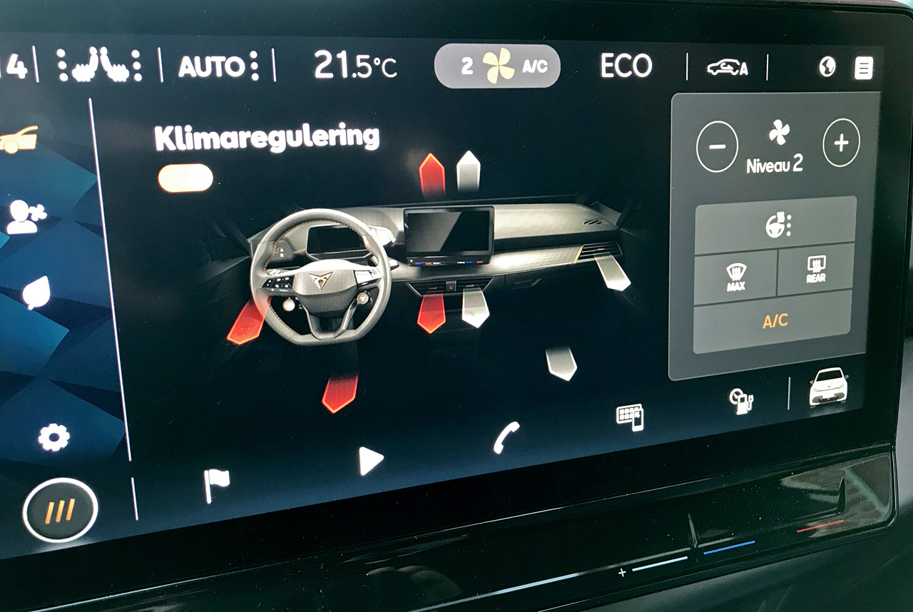Den 12 tommer store touchskærm til betjening af alskens funktioner er “beriget” af et utal af undermenuer, og det kan ikke gentages ofte nok: At det er distraherende og potentielt farligt at skulle betjene skærmen under kørslen. For eksempel skal man igennem op til fem berøringer af skærmen for at få den rette varme i rattet. Endnu en ommer.