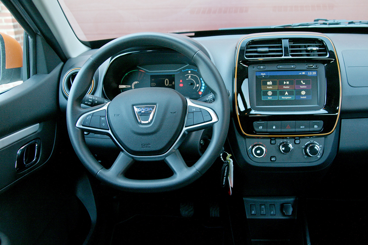Elmotoren aktiveres med en god, gammeldags tændingsnøgle, som man skal dreje, mens man har en tung fod på bremsen - ellers sker der ikke rigtigt noget - og nøglen skal vrides helt over, før bilen er køreklar. Gearvælgeren er en drejeknap mellem sæderne, og bilen går kun i gear, hvis man fastholder den tunge fod på bremsen. Træd på speederen og kør. Når rattet drejes, høres en syntetisk “knirkelyd” - men sådan skal servostyringen nok lyde i en Dacia Spring.
