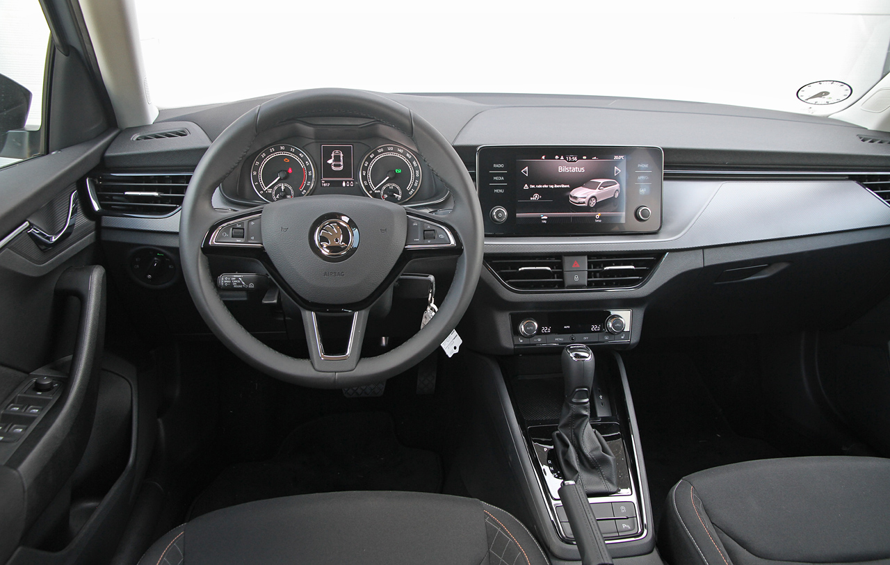 Bag rattet er Skoda Scala klinisk renset for bling-bling og smartness. Hvad du ser, er hvad du får. Og det vil sige nøgtern, logisk og letforståelig betjening af alle vigtige funktioner. Klimaanlægget betjenes med knapper, mens sekundære funktioner som radio, telefon og navigation styres fra rattet eller via infoskærmen i midterkonsollen. Sidstnævnte svæver som en iPad og står krystalklart med sin lækre glasoverflade. Her fornemmer man et touch af luksus i snusfornuftige Scala. Forsæderne virker solide og støtter egentligt godt, men man sidder lavt og vi savner lårstøtte.