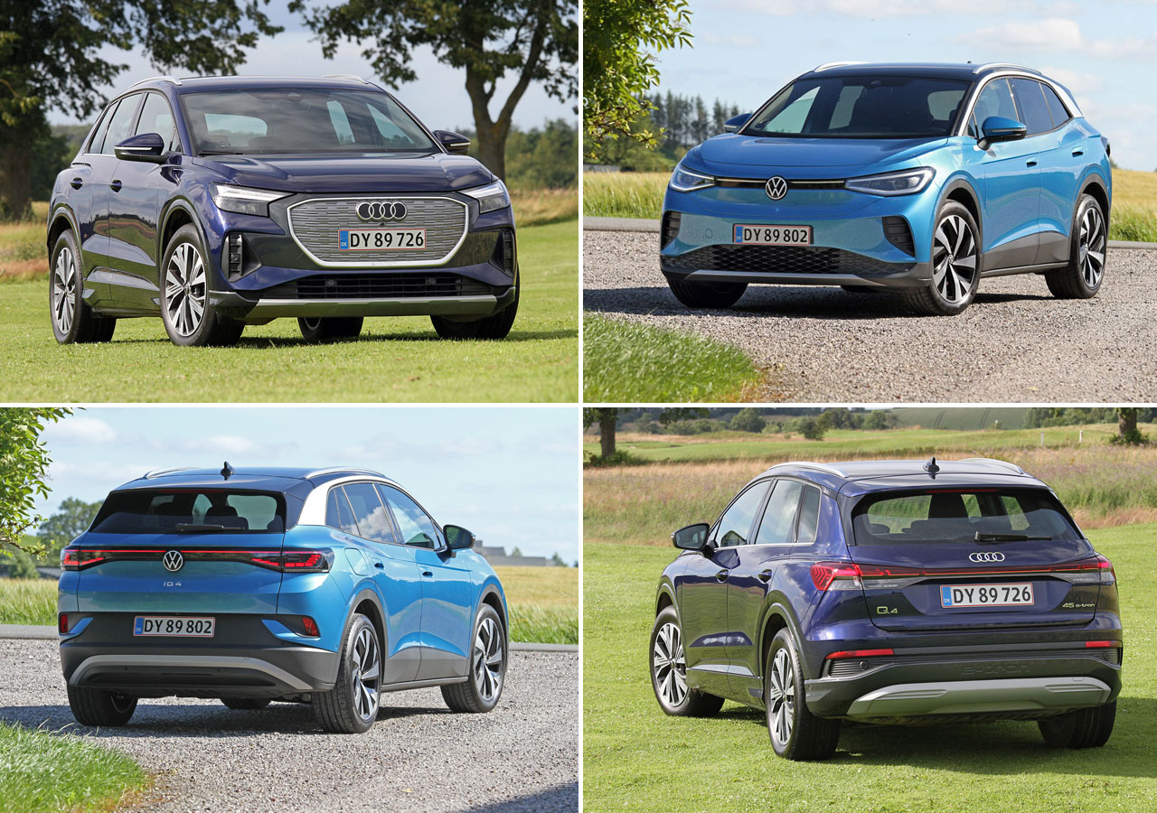 Praktisk SUV-design, respekterede navne og senest markante prisfald, gør Audi Q4 e-tron og VW ID.4 til to af Danmarks bedst sælgende elbiler. Begge blev lanceret i 2021 og fik for nylig et omfattende midtvejs-facelift med forbedret software, mere udstyr og en ny elmotor, der øger ydelsen fra tilbagelænede 150 kW (204 hk) til overskudsagtige 210 kW (286 hk). Trods flere kræfter bruger den nye motor mindre strøm. Audi Q4 har en rækkevidde på 530 km efter WLTP-normen, mens VW ID.4 når ud på 560 km.