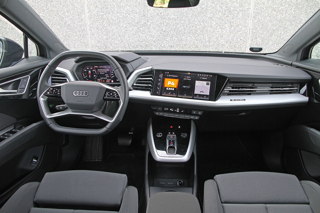 Audi har designet en Audi-typisk førerplads med omfattende, digital instrumentering bag rattet og en central skærm, der ser lille ud sammenlignet med den i ID.4. Til gengæld har Audi ofret penge på en række fysiske knapper, der gør det nemmere at justere især klimaanlægget. Sæderne med lændestøtte er også bedre.