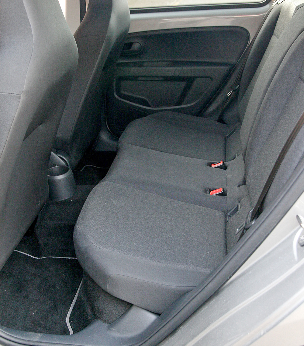e-Up er 4-personers, og de to, der er sikkerhedsseler til på bagsædet, skal ikke være for langlemmede. Dertil er benpladsen og loftshøjden i den 3,6 meter lange mikro utilstrækkelig. De bagerste sideruder kan vippes op bagtil.