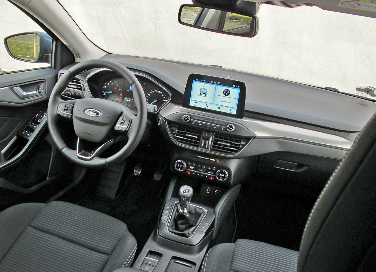 Foran er der godt med albuerum, og man sidder godt i sæderne, der både er faste og komfortable og kan justeres, så chauffører i alle størrelser kan finde en behagelig kørestilling. Den 8 tommers touchskærm, som er standard , er velplaceret øverst på instrumentbordet og samler en masse funktioner. Dermed er der ryddet grundigt op i knapper og greb, hvilket giver ro og overblik. Hvis du bestiller Focus Titanium med den adaptive fartpilot til ca. 5.500 kr., så kan bilen genkende hastighedsskilte og selv justere farten efter dem, så du slipper for fartbøder.