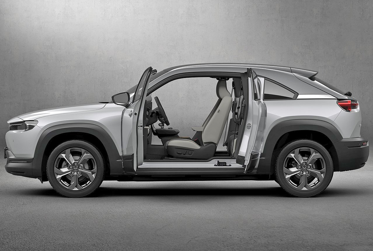 Til gengæld har man fjernet B-stolpen og flyttet bagdørenes hængsler bagud til C-stolpen. Dermed er bagdørene bagudvendte, så for- og bagdøre åbner modsat hinanden og åbenbarer et hul midt i bilen. Bedømt ud fra billederne gør det dog ikke adgangen til bagsædet nemmere end gennem CX-30’erens ’normalt’ hængslede bagdøre.