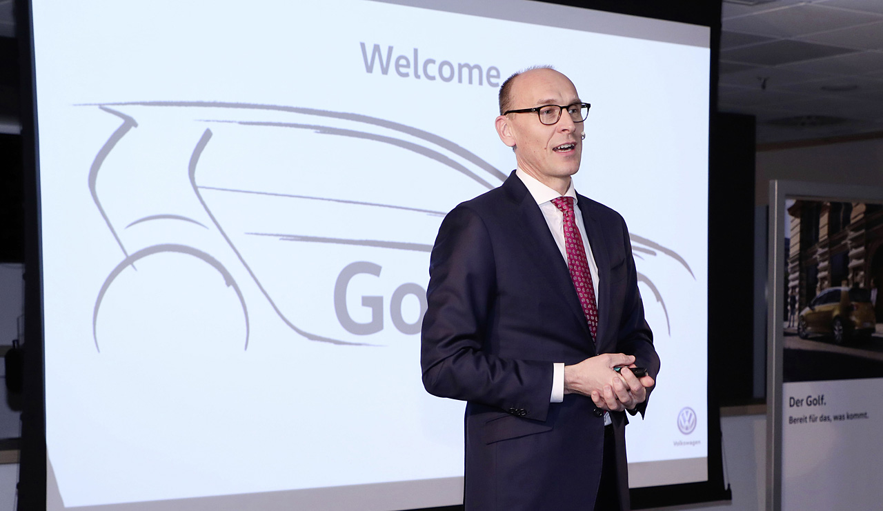 Dermed har VW formentlig også både slået stregerne og lavet de første 1:1 modeller. Vi må ikke se andet end stregtegningen bag Karlheinz Hell, der er chef for VW’s kompakt-modeller, men VW vil gerne fortælle, at den næste Golf – grosse überraschung – straks kan genkendes som en Golf, men i øvrigt bliver den hidtil mest avancerede: Topmodellerne vil blive selvkørende – formentlig ved hastigheder noget over 50 km/t – mens et elsystem på 48 volt i praksis gør alle kommende Golf-modeller til minimum ’mild-hybrid’ modeller.