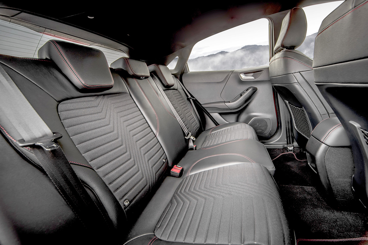 Trods 10 ekstra centimeter mellem akslerne i forhold til Fiestaen er bagsædet ikke blevet til en balsal. Pladsen til lange ben lader noget tilbage at ønske, og da Puma-designet også er mere coupé end stationcar, er loftshøjden over bagsædet heller ikke gavmild.