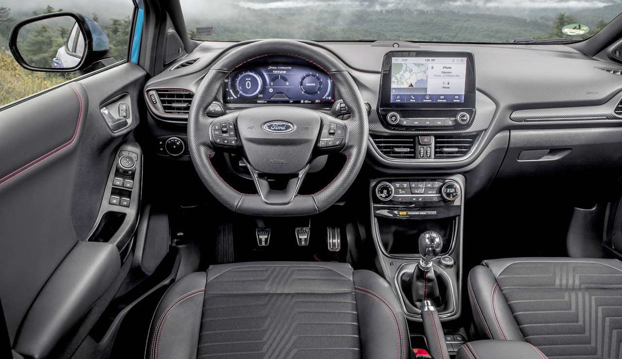 Sportsforsæderne i ST-Line smyger sig om kroppe i enhver størrelse, og det er intet problem at indrette sig med perfekt afstand til det fede læderrat og de alubeklædte pedaler. Man sidder i sagens natur noget højere end i den lave og meget sporty Fiesta. Helt nøjagtigt tre centimeter højere over asfalten, og det giver en åbenlys fornemmelse af godt overblik. A-stolpen, altså stolpen mellem forrude og fordør, er meget “langstrakt”, og det kan give nogle døde vinkler i synsfeltet, når man skal orientere sig i vejkryds.