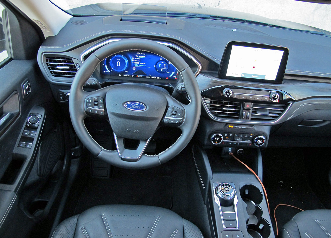 Den – eller nærmere de – yder samlet 225 hk uanset, hvilken udgave af Kuga PHEV, du vælger. Det gør den til den mest kraftfulde bil i Kuga-programmet. Plugin-udgaven af Ford Kuga er bygget op omkring en 2,5-liters benzinmotor med 152 hk og en elmotor, der yder op til 130 hk. Gearskiftet er trinløst CVT-gear – en geartype, vi ellers har været efter for piske at motoren op i omdrejninger uden megen effekt, men det har Ford fået styr på. Elmotoren er kraftig nok til, at du kan køre på ren el op til 135 km/t., men skal der accelereres hurtigt, arbejder benzin- og elmotoren side om side, og så har du alle 225 hk til rådighed. Eneste anke herfra til en ellers lækker motorpakke er, at vi godt kunne tænke os en længere rækkevidde på ren el end de nuværende opgivne 56 km. I testugen blev det i øvrigt kun til 46 km på el, da bilen ikke måtte lades op pga. en mulig fejl. Og rækkevidden på 71 km/l efter WLTP-normen, skal du slet ikke sætte næsen op efter. Vi nåede et gennemsnitligt forbrug på ca. 19 km/l. Fornemt for en bil af Kugas størrelse, men det afhænger helt af dit kørsels- og lademønster.