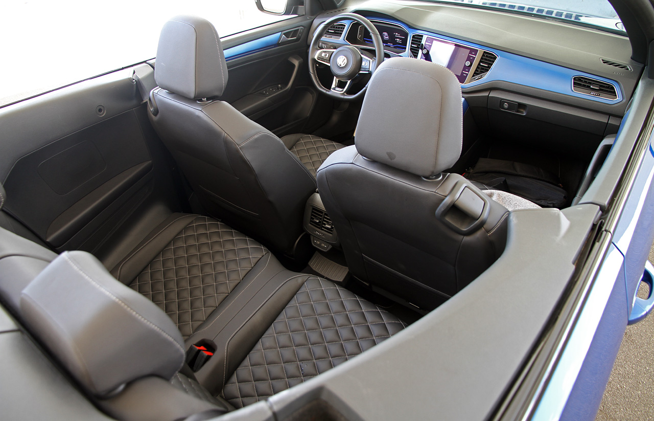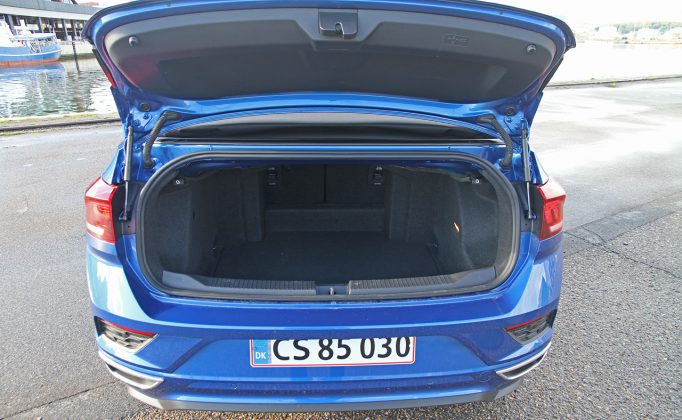 Beskyttelse mod vind og vejr når kalechen er nede er afgørende i en cabriolet – ellers beholder du bare ’kluden’ på. Her skuffer T-Roc Cabriolet ikke: Elmotorer kører kalechen op og ned på få sekunder, og den relativt stejle forrude yder fin beskyttelse mod vinden. I hvert fald når du benytter den læskærm, som placeres henover bagsæderne lige bag forsæderne. Du kan roligt lade skærmen være på, for pladsen på bagsædet er yderst begrænset. Det samme gælder pladsen i bagagerummet, der næsten er halveret til beskedne 280 liter. Til gengæld sørger den høje bagdel for, at åbningen er relativt stor. Men pas på ryggen, for alle varer skal ind og ikke ned i bagagerummet.