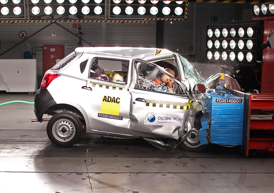Nul stjerner lød dommen på, da støvet, glasskårene og den sammenkrøllede Datsun havde lagt sig til rette på gulvet efter at have ramt barrieren med 64 km/t. På videoen – link herunder – kan man se, hvordan bilens bund kollapser og crashtestdummyen banker hovedet ned i først rattet og derefter den øverste kant af instrumentbrættet. Og nej, airbag er ikke standard i Datsun Go, så sidder du bag rattet, må du bogstaveligt talt parere en frontalkollision med panden.
