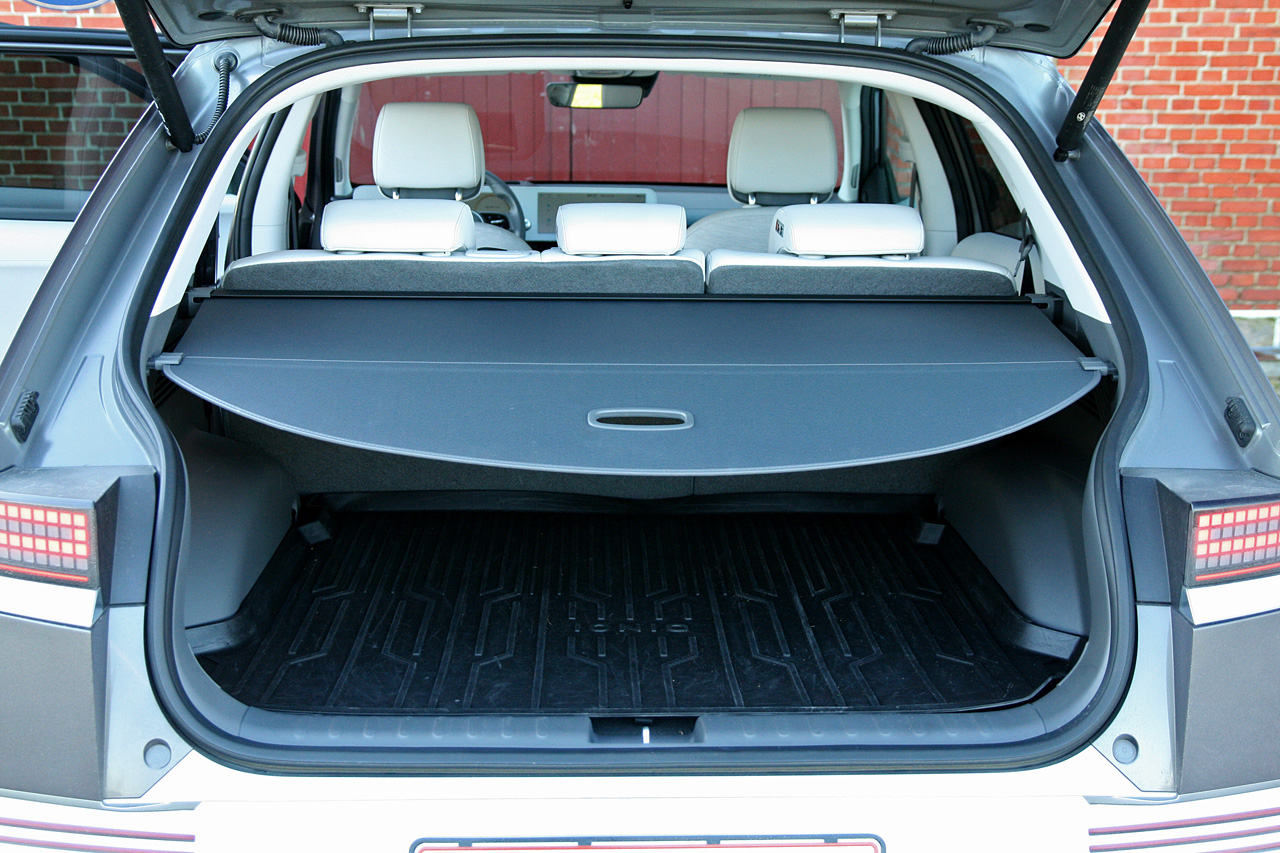 Bagagerummet er på 527 liter, det er bredt og dybt, men den skrå bagrude og høje bund – da elmotoren ligger over bagakslen – gør, at de 527 opgivne liter opleves mindre. På plussiden tæller det 57 liter store opbevaringsrum under fronthjelmen.