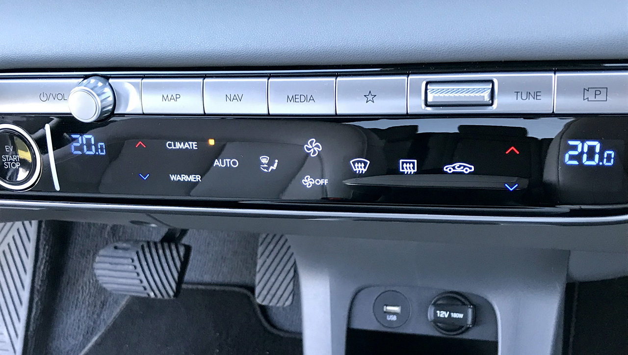 Under touchskærmen i midterkonsollen sidder et aflangt display, hvor man med berøring af symboler tænder for elbagruden og betjener klimaanlægget. Det fungerer ikke optimalt, som var det en dreje- eller trykknap, men det fungerer bedre end at skulle »touche« sig igennem flere menuer.