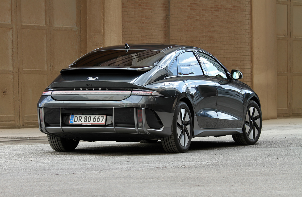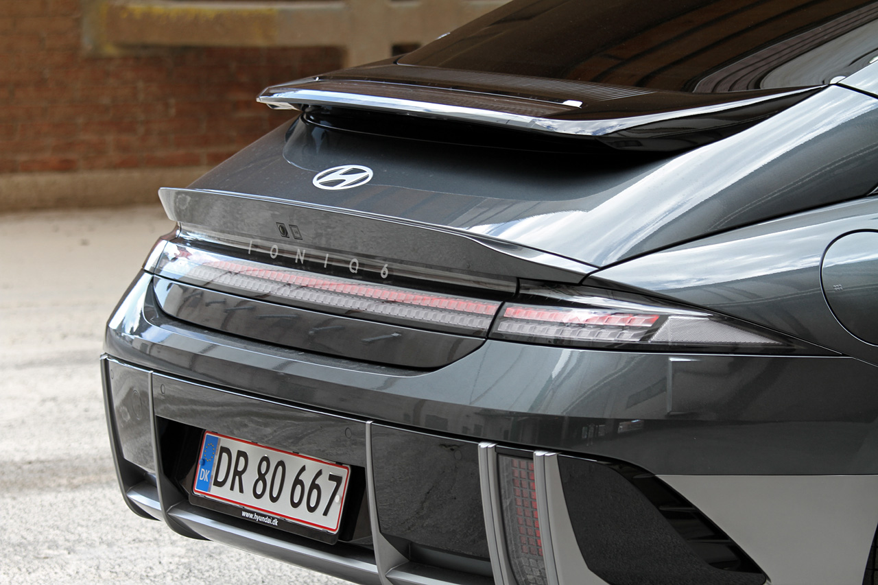 Med Ioniq 6 har Hyundais ingeniører arbejdet målrettet med at reducere den luftmodstand, der mere end noget andet begrænser elbilers rækkevidde. Hyundai kalder selv bilen en ’streamliner’. I profil er det tydeligt, at Ioniq 6 minder om en flyvinge. Lukkede fælge, små luftkanaler og en front, der kan lukke sine luftindtag får Ioniq til at skære sig gennem luften. Bagude får to spoilere og flere diffusere luften til at forlade bagenden med så lidt turbulens og dermed modstand som muligt. Luftmodstandskoefficienten er banket helt ned på 0,21. Til sammenligning er den 0,29 på søsterbilen Ioniq 5. Det er en kæmpe forskel, der får større betydning, jo hurtigere du kører. Det vender vi tilbage til.