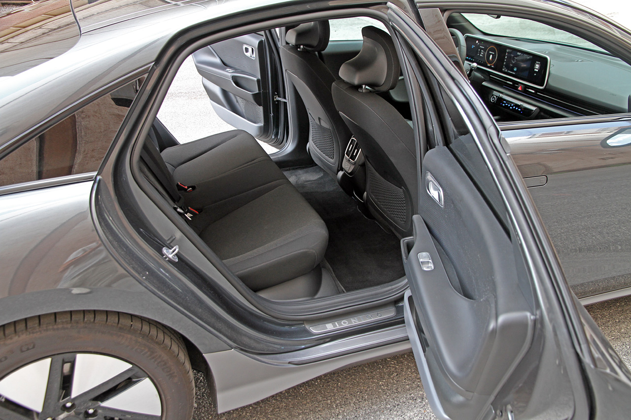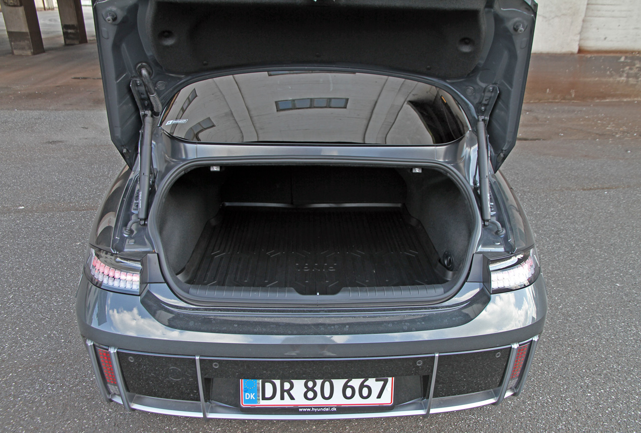 Bagsædet er nærmest overdådigt. Med en akselafstand på næsten tre meter kan undertegnede på 190 cm uden problemer sidde med benene over kors. Udfordringen er taghøjden. Taget skråner så meget, at voksne sidder tæt på loftet. Måske skulle Hyundai have rykket bagsædet lidt frem. Det ville også give mere plads i det lidt beskedne bagagerum, der blot rummer 400 liter og ydermere er hæmmet af en lille åbning.