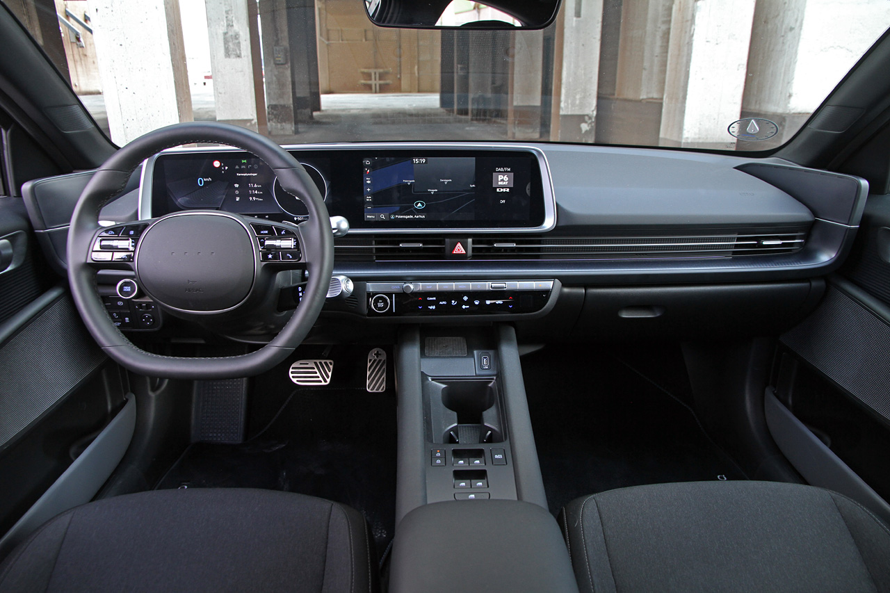 Kort fortalt er førerpladsen stort set løftet uændret fra Ioniq 5 og over i Ioniq 6. Det betyder masser af plads i gode sæder og et relativt betjeningsvenligt layout med to store skærme og en mindre, separat ’touchpad’ til ventilationsanlægget. Det sidste fungerer fint, og gør det nemmere at regulere varmen end i mange andre elbiler med skærmbetjening.