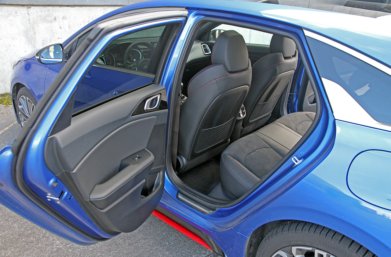 Taget er rykket tættere på hovedet og skaber en mere intim atmosfære, der faktisk klæder en sportslig designer-bil som ProCeed godt. Udfordringen er, at benpladsen på bagsædet er til den afmålte side: Her er samme plads som i en almindelig Ceed, men vi husker den foregående model som en tand mere rummelig. Bagagerummet er egentlig stort – brochuren lover hele 594 liter. Gulvet er dog meget højt, fordi ProCeeds bagagerum er indrettet med flere 'kælderrum'. Sammen med en høj læssekant gør det bagagerummet mindre anvendeligt til barnevogne og kufferter, der hurtigt kommer i konflikt med bagruden. Omvendt må vi kreditere Kias designere for at have tegnet en bagdel, som du får lyst til at give et kærligt klap. Det er også en kvalitet..