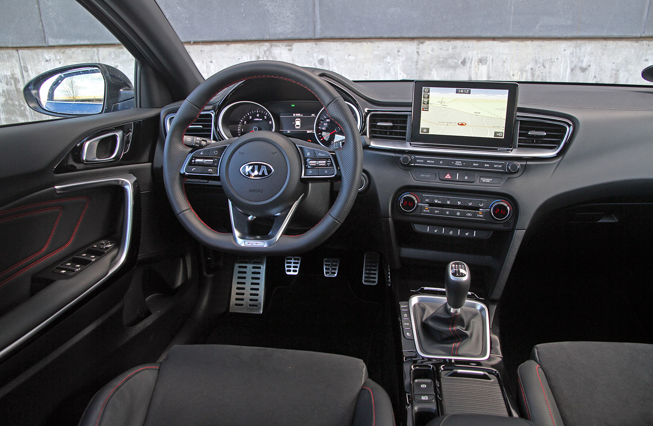 Mens designerne virkeligt har arbejdet med ProCeeds ydre former, er kabinen løftet direkte over fra den almindelige Ceed. Eneste forskel er, at taget er 'choppet' med knapt fem centimeter. Fint nok, for bortset fra indretningsarkitekternes hang til sorte og koksgrå nuancer, er kabinen ganske lækker med nydelige overflader og solid byggekvalitet. Instrumenterne er krystalklare, knapperne klikker på den kvalitetsbevidste måde og den store infotainmentskærm er knivskarp og nem at betjene. Du sidder godt i sportssæderne, der især glimrer ved at yde bedre støtte under lårene end sæderne i en standard-Ceed. Et klart plus på langturen.