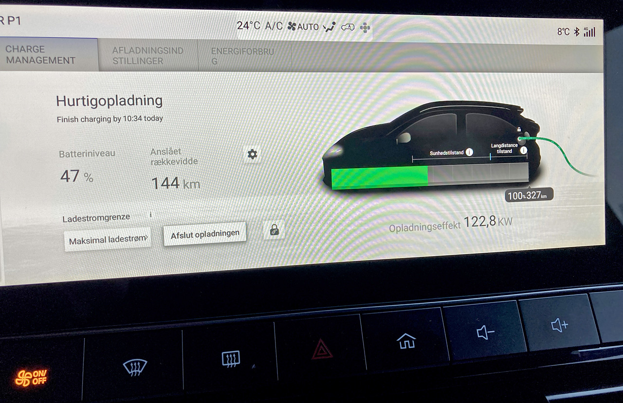 Opladningstid: 35 minutter (10-80 pct. ved DC-lynlader), 7 timer (0-100 pct. ved 11 kW AC)