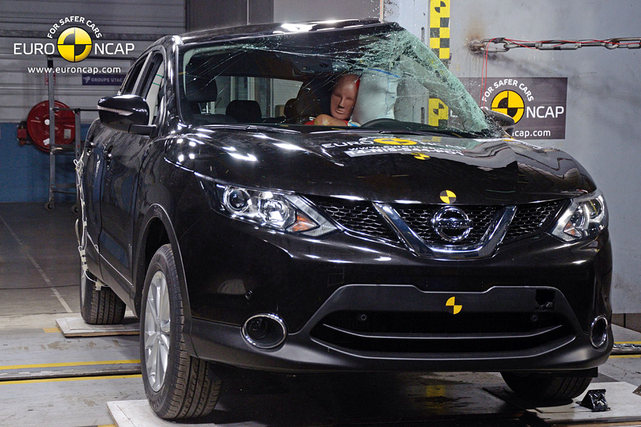 Nissan Qashqai blev den første bil, der kom til 'eksamen' i crashtestorganisationens Euro NCAPs skærpede crashtest. Fra 2014 lægger Euro NCAP nemlig større vægt på aktive sikkerhedssystemer som automatisk nedbremsning og vognbaneassistent. Samtidig bedømmes beskyttelsen mod piskesmæld nu for både for- og bagsædepassagerer, lige som Euro NCAp har skærpet beregningen for sikkerheden for voksne og børn samt fodgængere.