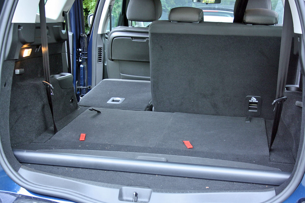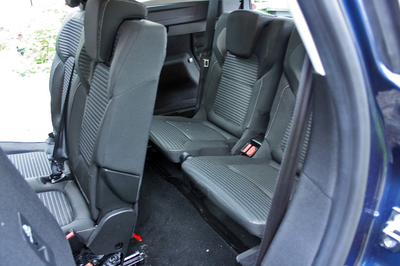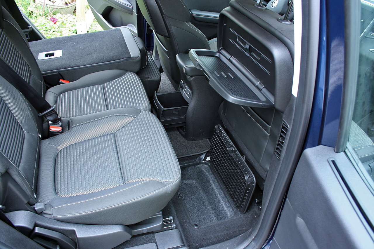 Tredje sæderække er i praksis til børn, og de skal passe på ikke at få klemt tæerne under anden sæderække, hvor sæderne kan justeres frem og tilbage, og ryglænets hældning indstilles. Med en chauffør over 180 cm er der reelt kun knæplads til et større barn på pladsen bagved - især med de ellers belejlige flyborde til 900 kr. ekstra, der fylder for meget bag på forsæderne. Vi savner også tre enkeltsæder i stedet for opdeling i et enkeltsæde i førersiden og en 'bænk' til to - selv om den midterste plads er forbedret. På plussiden er der opbevaringsrum under gulvet, og friskluftdyser, mens det er nærigt, at gardiner i sideruderne og opladningsstik koster ekstra. Alt i alt er benpladsen på bagsæderne – trods 280 cm mellem akslerne – skuffende.