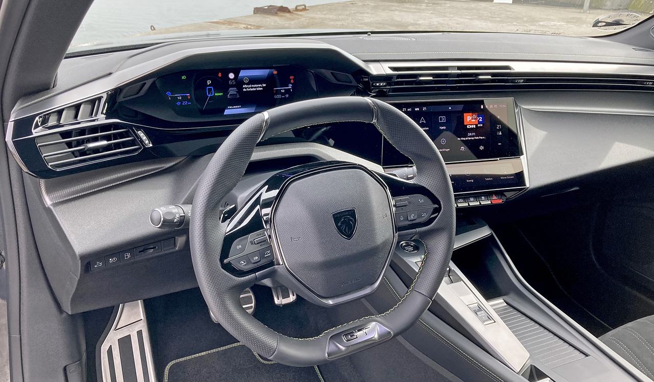 i-Cockpit er betegnelsen for den særlige Peugeot-indretning, hvor de centrale instrumenter skal aflæses over det lille rat og ikke gennem. Hvis man bliver nødt til at have rattet justeret højt, kan man dog risikere, at det lille rat forstyrrer udsynet til instrumenterne. Om man kan lide det eller ej, er en smagssag.