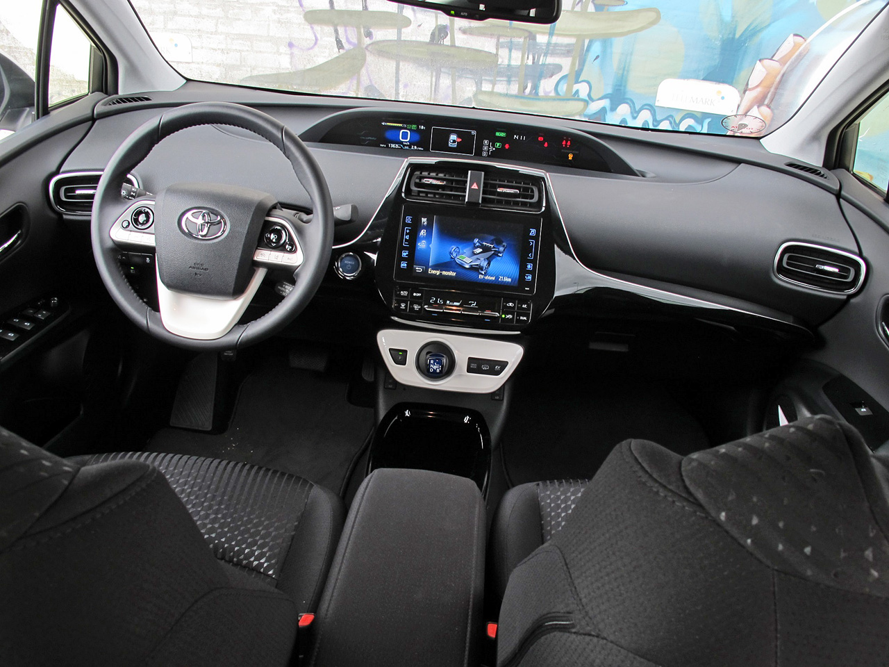Vi glæder os over mange ting bag rattet i Prius Plug-in og irriteres af nogle småting. Først og fremmest er der lys og godt udsyn samt masser af albuerum på forsæderne, og førerpladsen er udlagt til en afslappet kørestil med komfortable forstole , der omfavner både stor og lille. Finish og plastkvalitet er på et fint niveau og udstyret omfattende, selv fra basismodellen H3, med blandt andet head up display, der viser de vigtigste oplysninger på en lille skærm i forruden. Dette og flere andre udstyrsstykker som blind vinkel overvågning og alarm for bagved krydsende trafik forsvinder dog af en eller anden grund fra udstyrslisten, hvis du vælger testens solcelle-udgave. Måske for at holde prisen nede. Som chauffør har du dog stadig hjælp fra adaptiv fartpilot, aktiv vognbaneassistent, vejskilteassistent og automatisk op- og nedblænding af fjernlyset. Og med navigation og danske menuer er livet er let og trygt bag rattet i Prius. Glat sort pianolak i midterkonsollen, der hvor mobil, nøgler mm. skal ligge er dog en svipser, ligesom midterarmlænet ikke kan justeres i højden.
