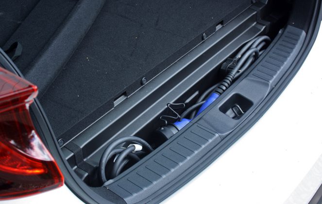 De 95 celler i Prius Plug-in's 120 kilo tunge lithium-ion batteri med en kapacitet på 8,8 kWh lades op på ca. 2 timer i en ladestander og på ca. 3 timer og et kvarter i en almindelig stikkontakt. Det ærgrer os, at ladestikket er placeret bagtil på ventre side. Placeret forrest på bilen er stikket nemmere at benytte i hverdagen, synes vi.