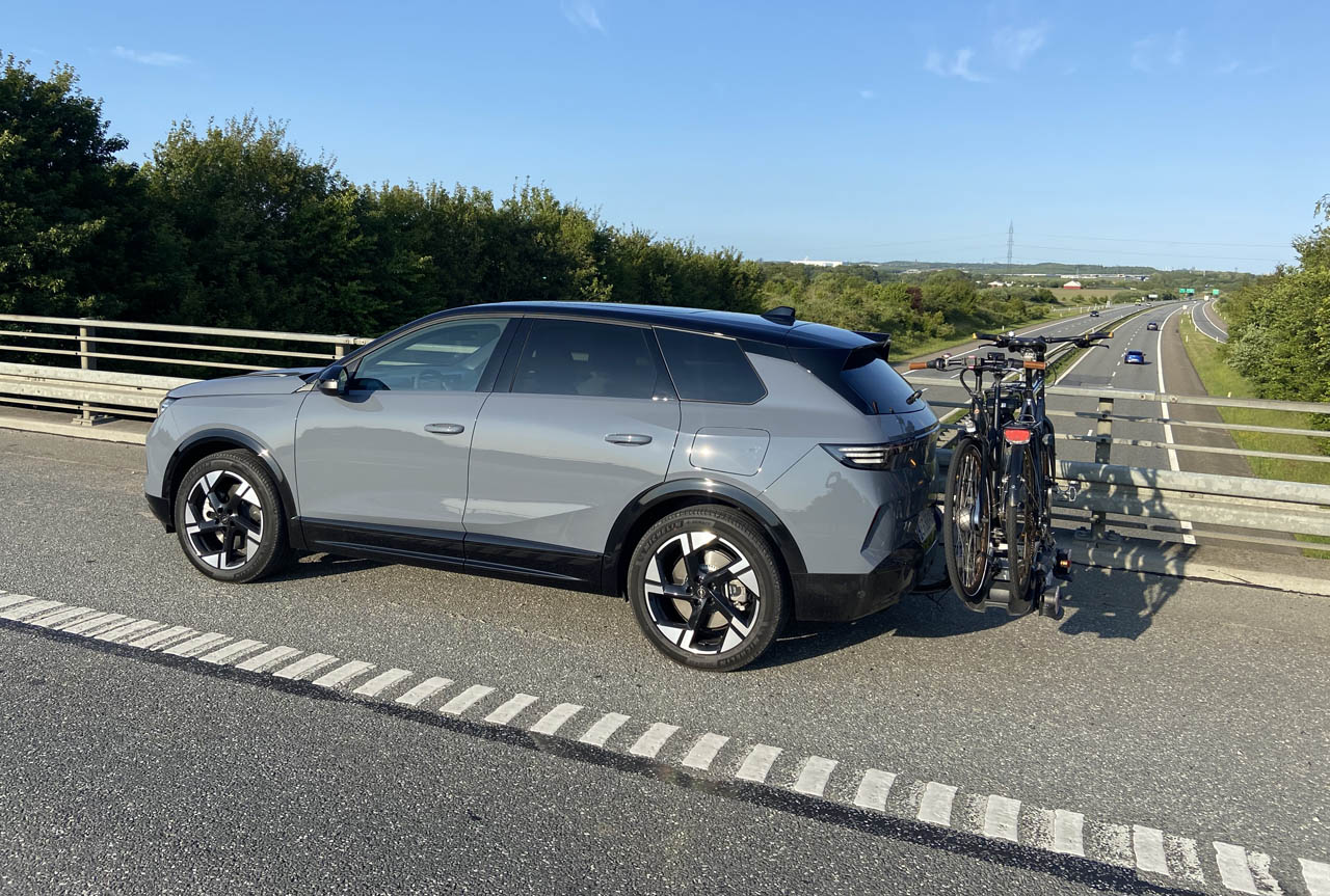 Bagefter kørte vi præcis samme rute under præcist samme forhold med en cykelholder med en dame- og herrecykel bag på den store Grandland. Den samlede vægt er på 42 kg, men det er ikke vægten, der koster energi – det er den øgede luftmodstand. Og den koster faktisk en del energi. 3,8 km pr. kWh målte vi turen med cykelholder til. Det øger altså forbruget med hele 10,5 procent at hænge to cykler på anhængertrækket.