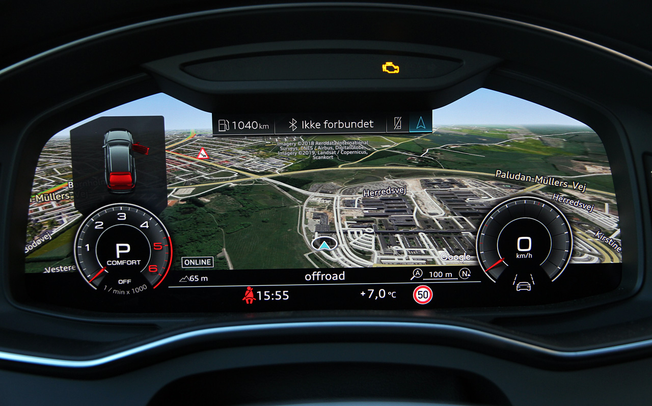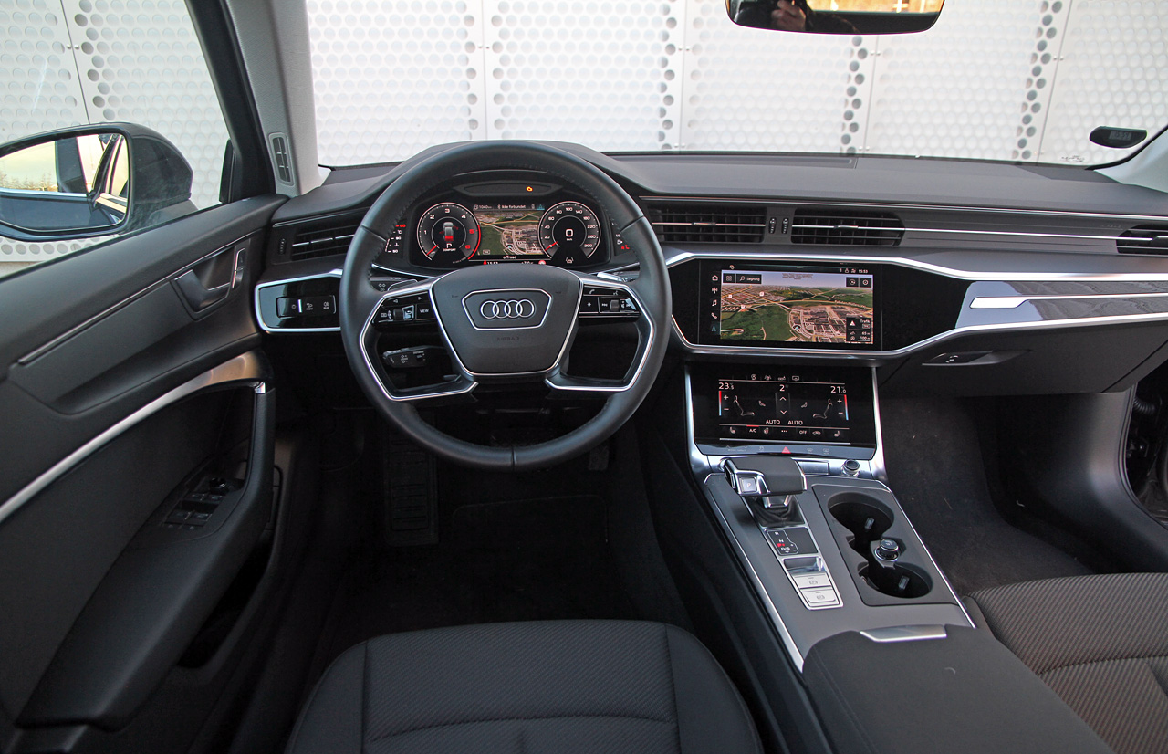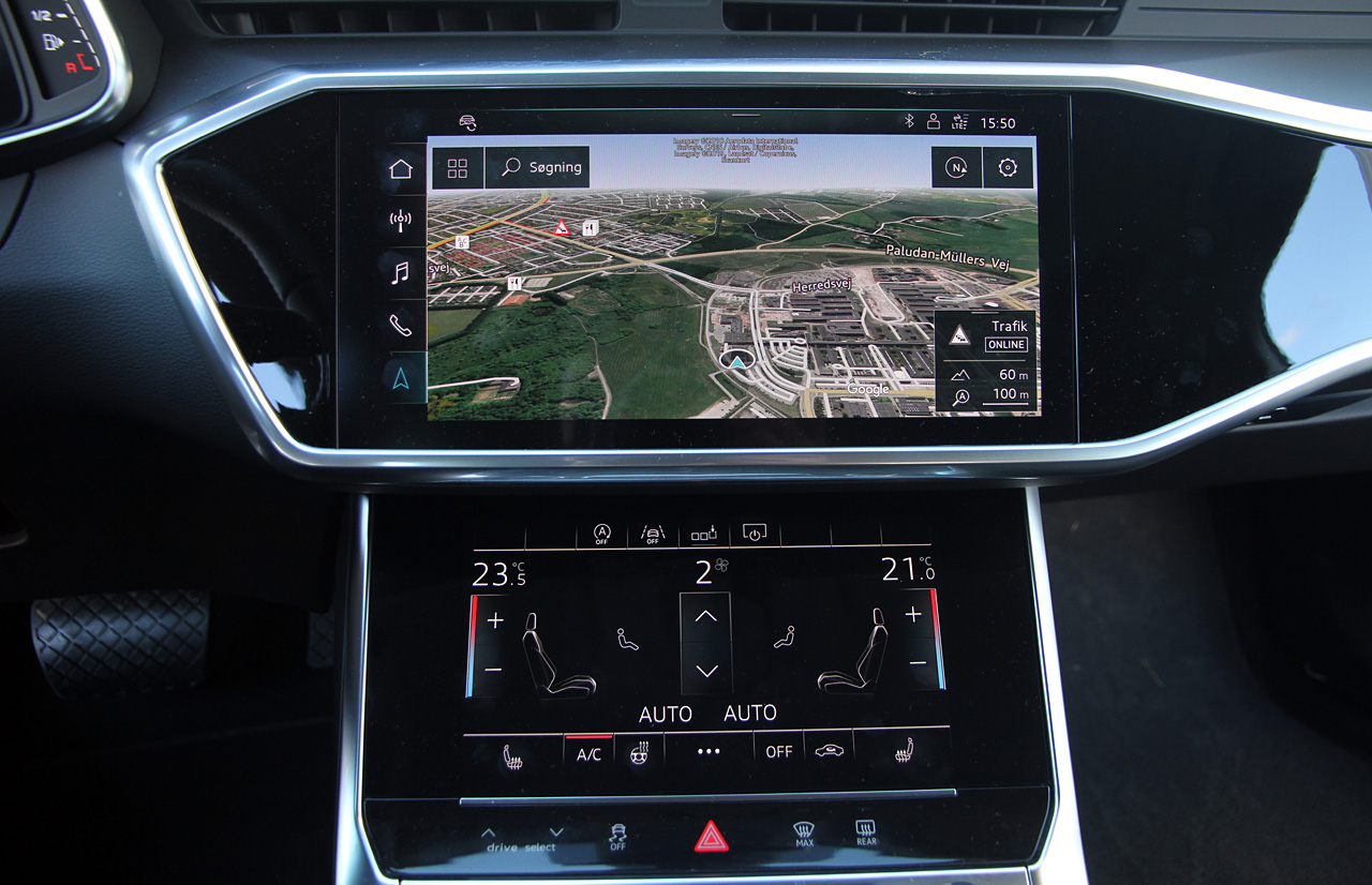 Audis gennemførte brug af digitale skærme giver afgjort A6 wauw-effekt. Forbilledet er utvivlsomt Tesla, der var først med ren skærmbetjening. Manglen på knapper – bortset fra tasterne i rattet – giver A6-kabinen et stilrent udtryk og et væld af betjeningsmuligheder. For eksempel bestemmer du selv, om du vil indtaste en adresse i navigationen på et tastatur eller 'skrive' med din pegefinger på skærmen. Det er übercool – men selv om skærmene klikker og vibrerer ved berøring, er du fortsat nødt til at kigge væk fra vejen for at betjene dem. Sikkerhedsmæssigt er skærmene en dårlig løsning.