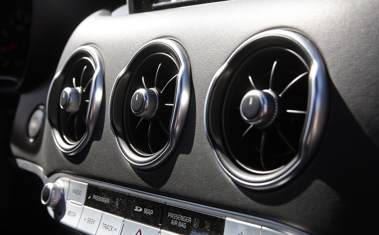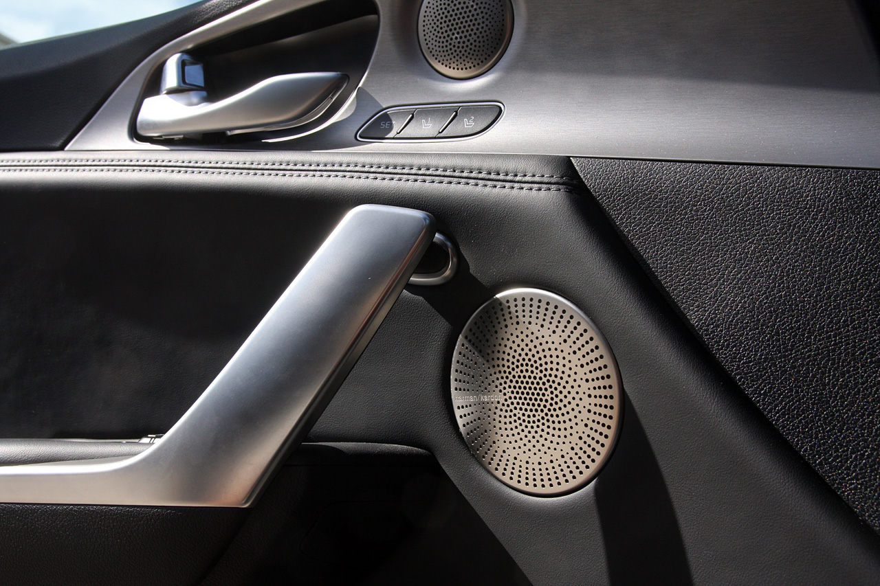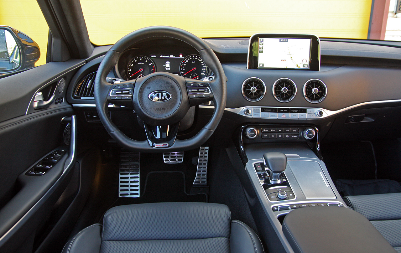 Lav, intim og med alle betjeningsgreb lige ved fingerspidserne. Stinger er lige så meget en 'drivers car' som forbilledet fra Bayern – og det mærkes på den fremragende ergonomi og de velpolstrede lædersæder, der byder på høj komfort time efter time på den tyske Autobahn. Førerpladsen har et lækkert touch af retro med analoge instrumenter i chronograph-look, runde luftdyser og ægte læder på instrumentpanelet. Med knapper der klikker som i en Lexus og en gearvælger, der ligner noget fra en Audi, er Kia faktisk på omgangshøjde med forbillederne. Altså lige indtil øjne og fingre falder på tre tarvelige detaljer: Airbagdækslet midt på rattet, dørlommerne og de indvendige dørhåndtag, der alle er udført i billig, hård plastic. Fint i en Picanto, men et brud på etiketten i denne klasse og en begynderfejl af Kia.