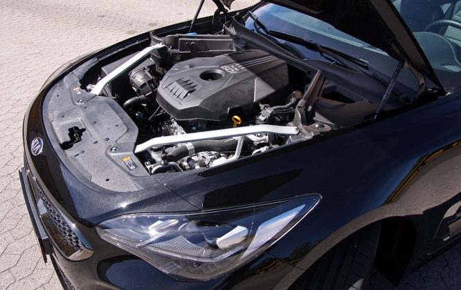 Baghjulstræk er et godt sted at begynde, hvis du vil have afbalancerede og dynamiske køreegenskaber. At hyre den tidligere chef for BMWs M-afdeling til at fintune undervognen er også et smart træk, så det er ingen overraskelse, at Stinger et langt stykke af vejen kører som en BMW 3-serie. Det er en kompliment – også selv om Stinger er en anelse dårligere til at filtrere skarpe ujævnheder fra, lige som hjulstøjen er lidt for tydelig på alt andet end nylagt asfalt.
