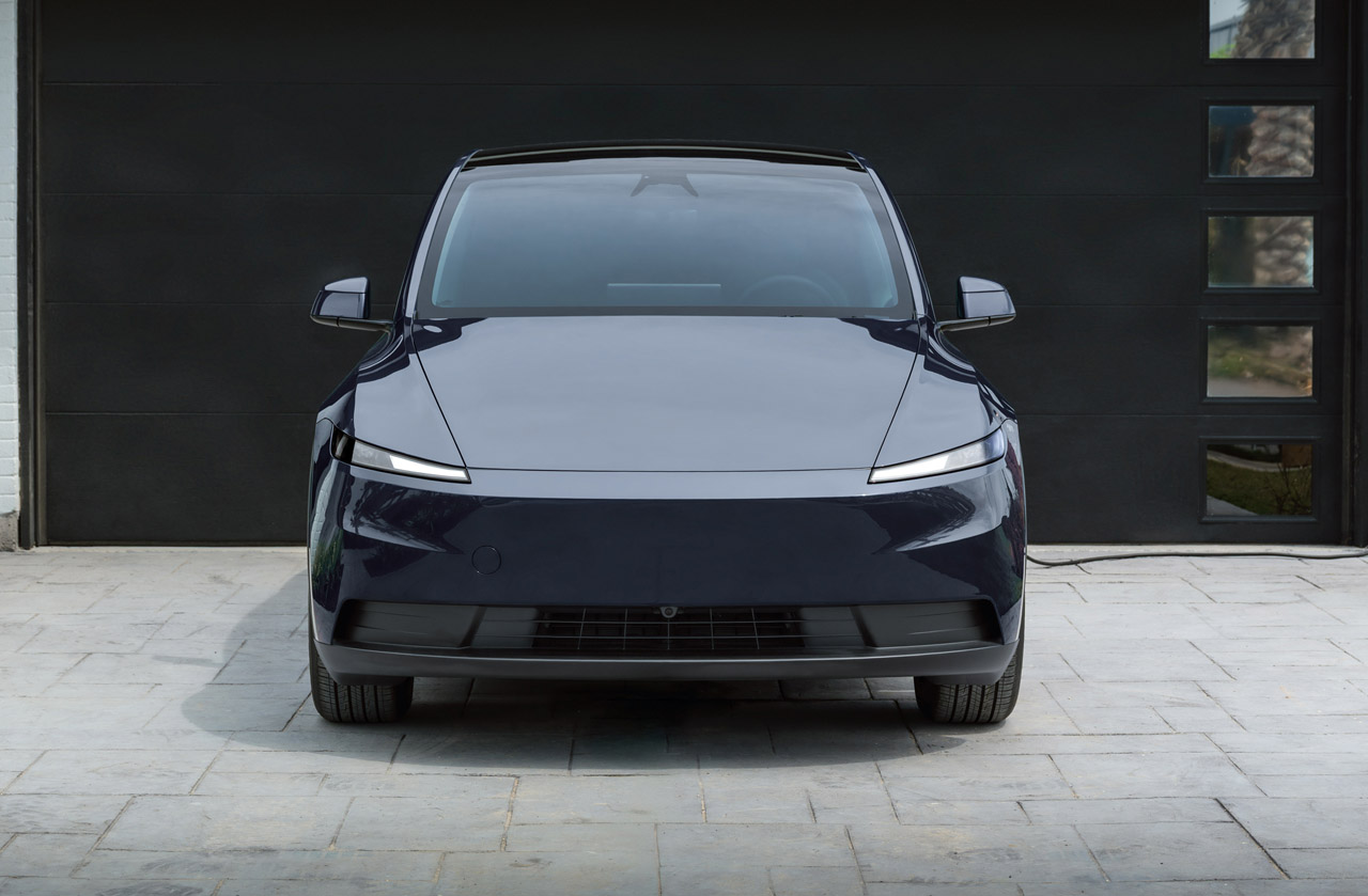 Udvendig ligner Model Y sig selv. Men glastaget er væk, det samme gælder de tværgående lygtebånd for og bag. Kigger man godt efter, kan man se, at lygtehusene til nær- og fjernlys nu er integreret i de smalle lygter, der umiddelbart ligner kørelys. Det kan lade sig gøre, fordi Standard-udgaven dropper de ellers fine LED-matrix forlygter.
