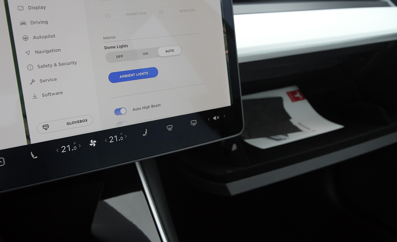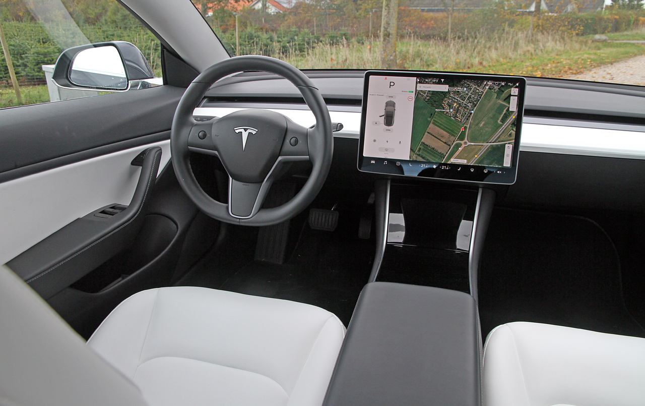 Bogstaveligt talt enestående - vi har aldrig set noget lignende: Al betjening er samlet i en centralt placeret skærm på 15 tommer. Her styrer du alt - selv handskerummet åbnes med et tryk på skærmen, mens speedometret er placeret i øverste venstre hjørne. Derudover findes der to knapper på rattet, der f.eks. justerer lydniveau og fartpilot. Udover knapper til elruder og de indvendige dørhåndtag er kabinen støvsuget for greb og instrumenter. At alt foregår via skærmen kræver tilvænning, men det fungerer faktisk, fordi det fuldstændig er som et betjene en iPad. Samtidig får Model 3-kabinen et stilrent udtryk. Kørestillingen er fremragende med et perfekt forhold mellem sæde, pedaler og det næsten lodretstående sportsrat. Desværre er sæderne lidt for bløde, så du savner bedre støtte på langturen.