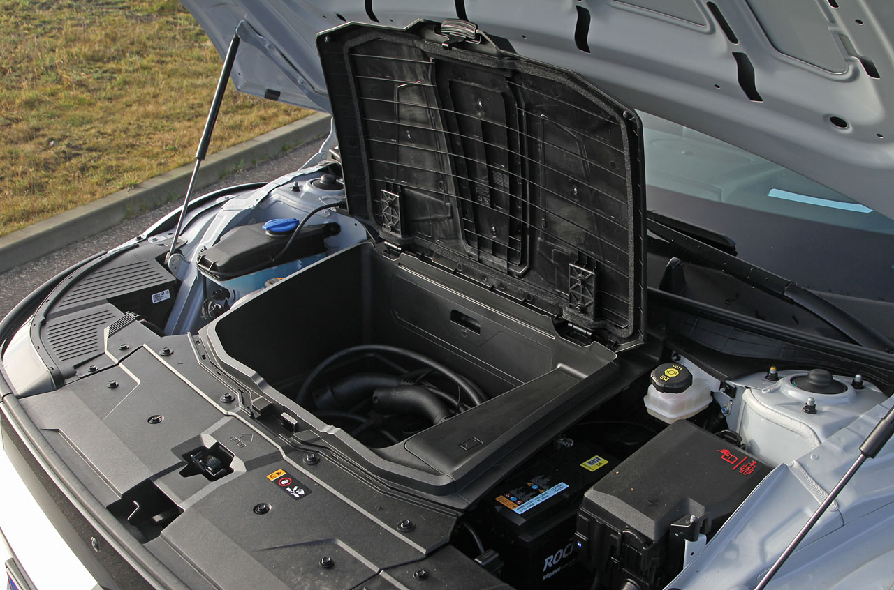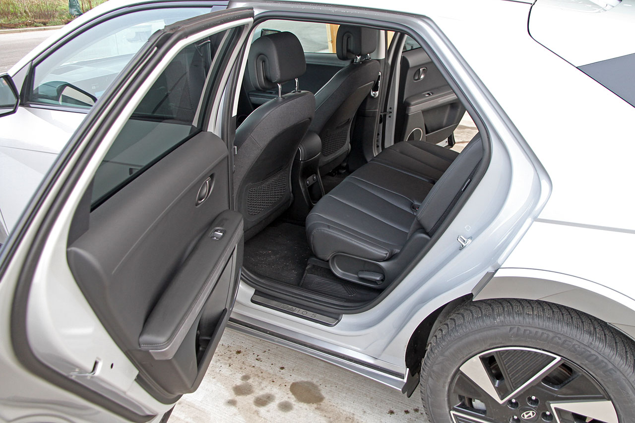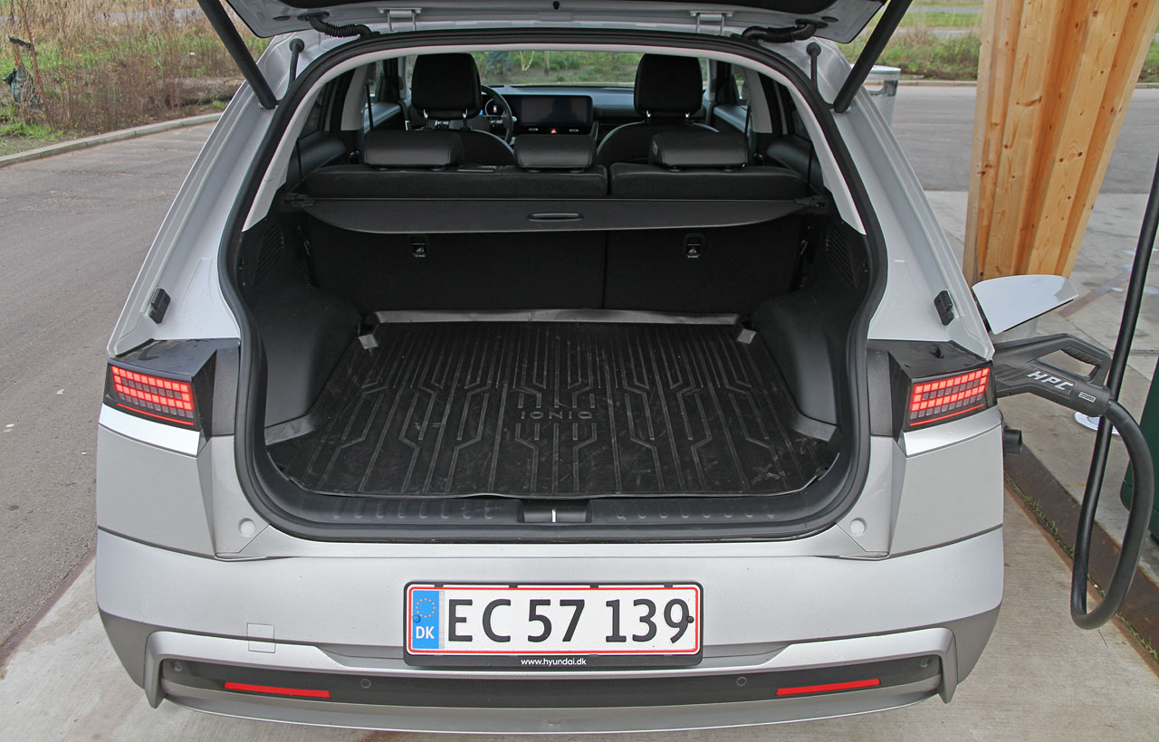 Med en længde på 466 cm er Ioniq en mellemstor bil. Men indvendig sørger en akselafstand på hele tre meter for overdådige pladsforhold. Vi er helt oppe i VW ID.7 rummelighed – og den er fem meter lang.
