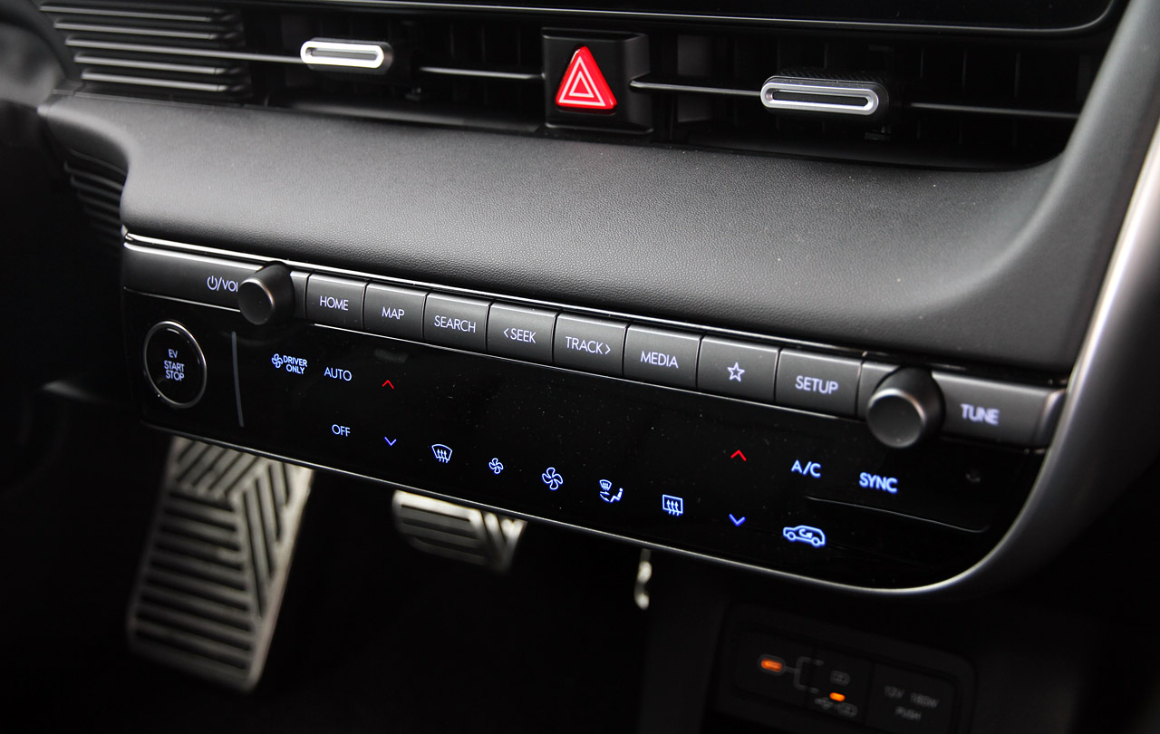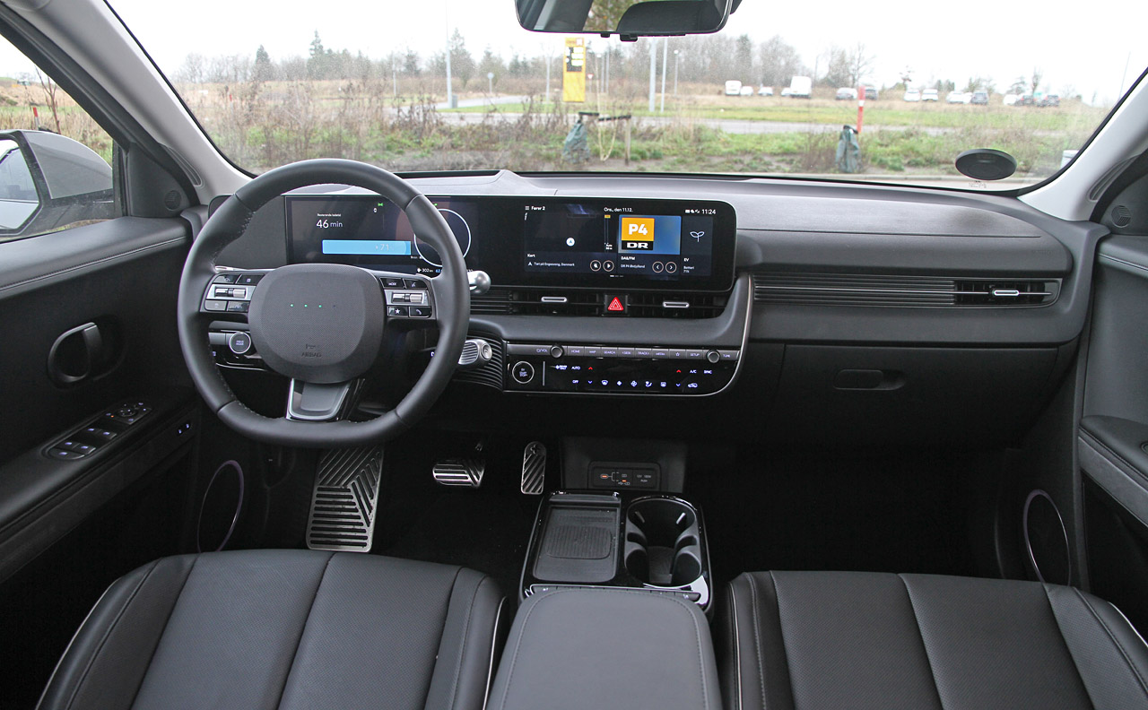 Hyundai benytter to brede, men lave skærme i Ioniq 5. En til instrumenter, en anden til infotainment, lyd og navigation. Til gengæld er betjeningen af ventilation og flere genvejsknapper til skærmmenuerne flyttet ned i deres eget område under skærmen i midterkonsollen. Lige midt imellem kan du placere din hånd på en polstret overflade. Sammen med både fysiske knapper og trykfelter gør det betjeningen lettere end i mange andre elbiler. Især fordi Hyundai har øget antallet af rigtige trykknapper. Også i rattet, hvor de fungerer fremragende. Sammen med enorm plads og god ergonomi – altså forholdet mellem sæde, rat og pedaler – byder Ioniq 5 på en af klassens mest behagelige og letbetjente førerpladser.