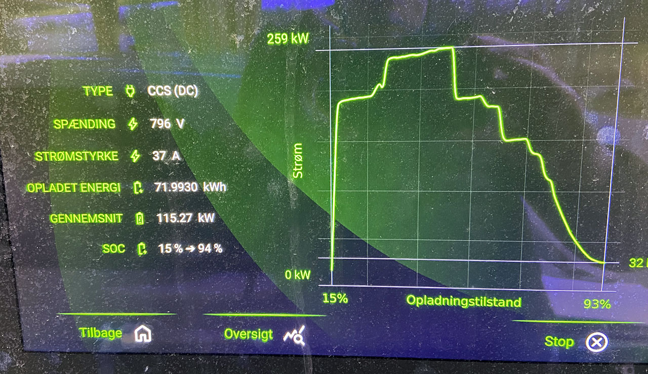 Opladningstid: 18 minutter (10-80 pct. ved 350 kW DC), 7,5 timer (0-100 pct. ved 11 kW AC)