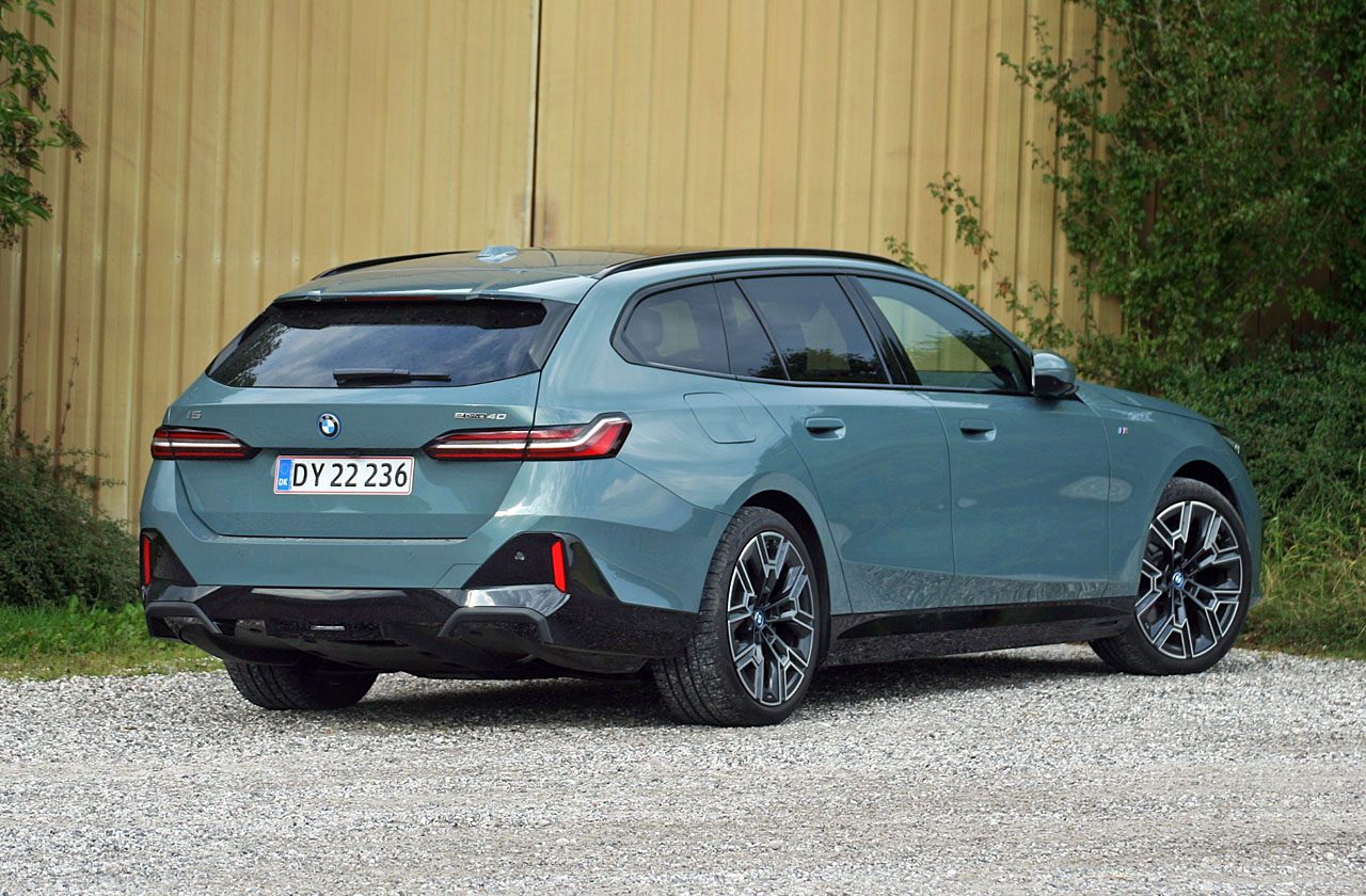 Testbilen hedder i5 eDrive40 Touring. i er BMW’s elektriske kendetegn, eDrive betyder baghjulstræk – står der xDrive, er der træk på alle fire – og 40 fortæller noget om motorydelse, som kræver kendskab til BMW-lingo. 40 yder 250 kW (340 hk), og den store i5, der hedder M60 xDrive, har 601 hk og firehjulstræk.